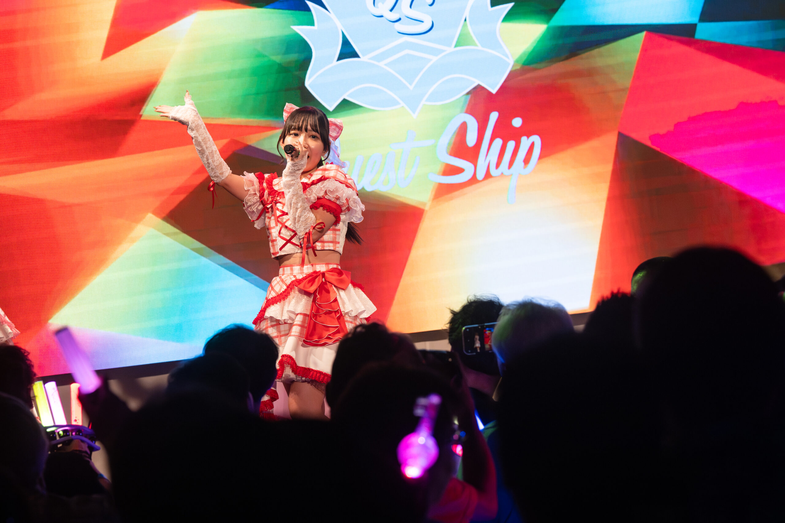Quest Shipの人気曲、『Love you! Need you! 最大級♡』がスタートすると、メンバーはフロア後方から登場し、文字通り、ファンと一体となりコールが巻き起こった。メンバーは2周年記念Tシャツと活動休止中の楠瀬ひよりの衣装をそれぞれ身に着け登場した。