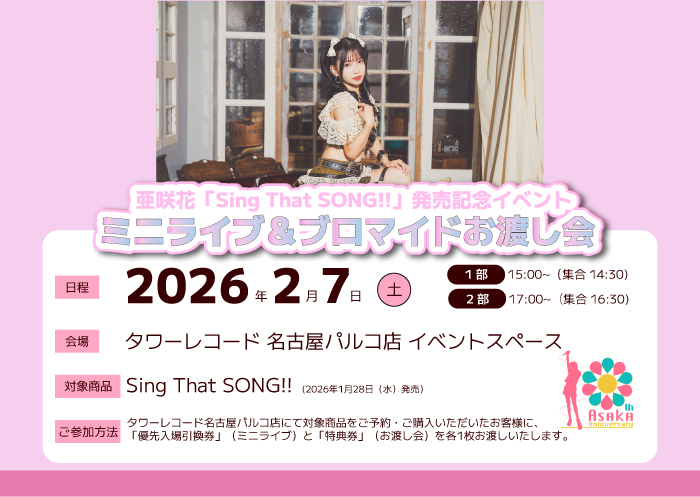 ネットサイン会や東京・名古屋でのミニライブなど、多彩な企画を実施します。対象商品<亜咲花『Sing That SONG!!』ATOM-0015>をご予約・ご購入で参加可能。