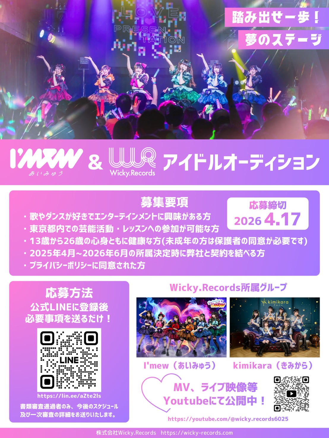 2026年春、I’mew(あいみゅう)新メンバーおよびWicky.Records新グループとして活躍できるタレント(才能)を募集。